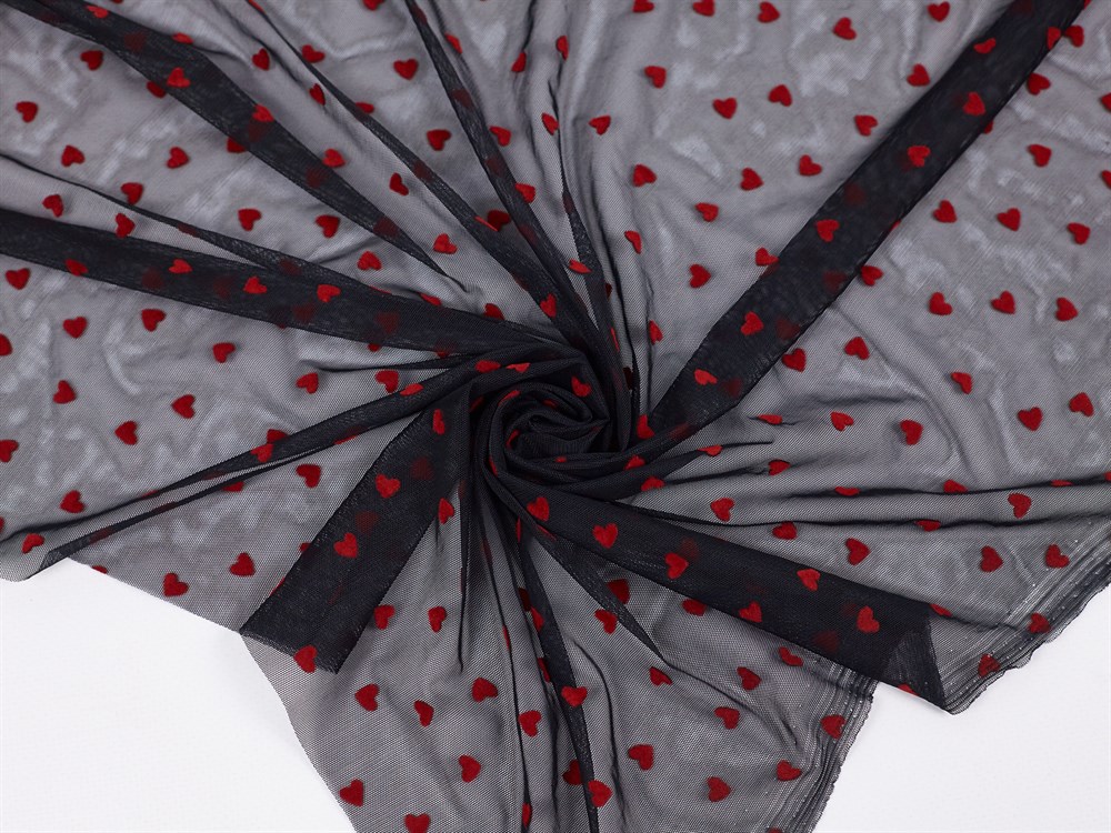 Эластичная сетка с флоковыми сердечками, цв. черный+красный