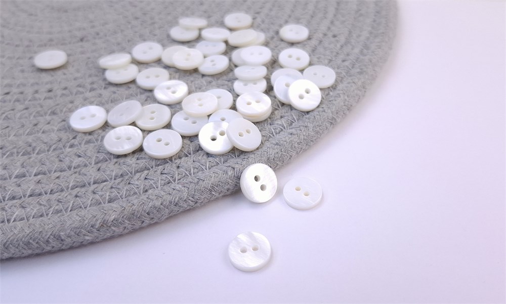 Перламутровые пуговицы – это пуговицы, которые изготавливаются из жемчужных раковин. Материалом для пуговиц служит внутренний слой оболочки раковины светлого цвета с блеском. Натуральные перламутровые пуговицы отличаются нежным внешним видом, очень красивыми радужными переливами на свету. Пуговица смотрится просто, но со вкусом, нежный перламутр роскошно переливается при ярком свете. Маленькая пуговица на два прокола подойдет для легкой одежды, такой как блузки, рубашки, летние платья, детская одежда, и для декоративных элементов, например, для отделки карманов или воротника на пальто или пиджаке.