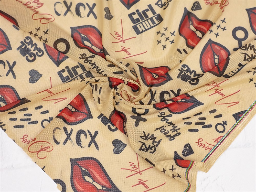 Сетка NUDE, тату-принт "Губы", цв. телесный