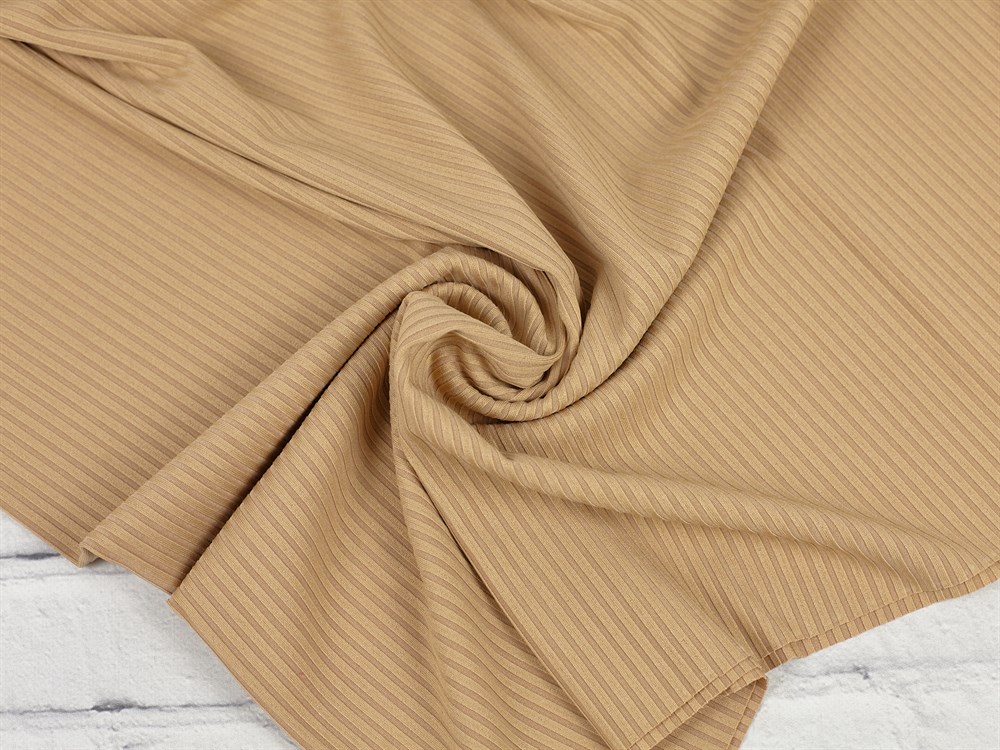 Ткань для шитья – трикотаж лапша - это эластичное трикотажное полотно в широкую продольную полоску. Ткань получила свое название благодаря характерной рельефной структуре - вертикальному рубчику, который вытягивает фигуру, стройнит, и при этом не стесняет движений. Материал тянется по утку и принимает любую форму. Подходит для пошива: платья облегающего силуэта, костюма для занятий спортом и для дома, свитера, водолазки, боди, юбки, детских вещей, майки, головных уборов, снудов и пр. Вещи из лапши гармонично сочетаются с элементами одежды, выполненными из других материалов. Водолазки подходят под классические джинсы, брюки, юбки. Сочетаются со строгими пиджаками, деловыми костюмами.